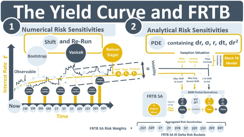 Market risk is the risk of losses due to adverse movements in market prices. FRTB requires that a bank set aside a capital amount commensurate with the size of its exposure to market risk. A risk factor is a traded financial instrument or a curve built from a group of instruments that the bank is exposed to. The price changes in multiple-instrument RFs are highly correlated. A yield curve is an example of a multiple-instrument RF. The instruments that are used to build it, e.g., deposits, futures, swaps are all exposed to changes in an underlying index (e.g., ESTR, SONIA, EFFR or LIBOR3M). Each instrument has exposure to a different maturity segment. The YC is the most important RF in a trading book. Valuations of OTCs in all risk classes require the multiplication of expected future cash flows by discount factors that are extracted from the YC.